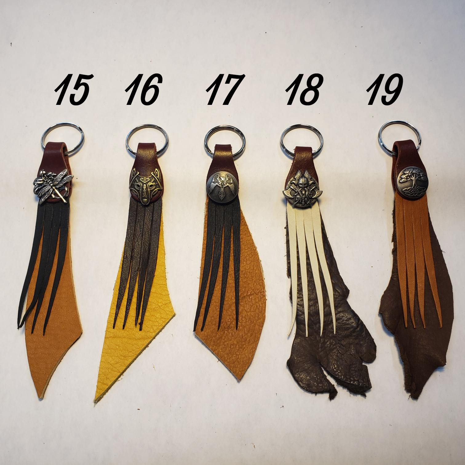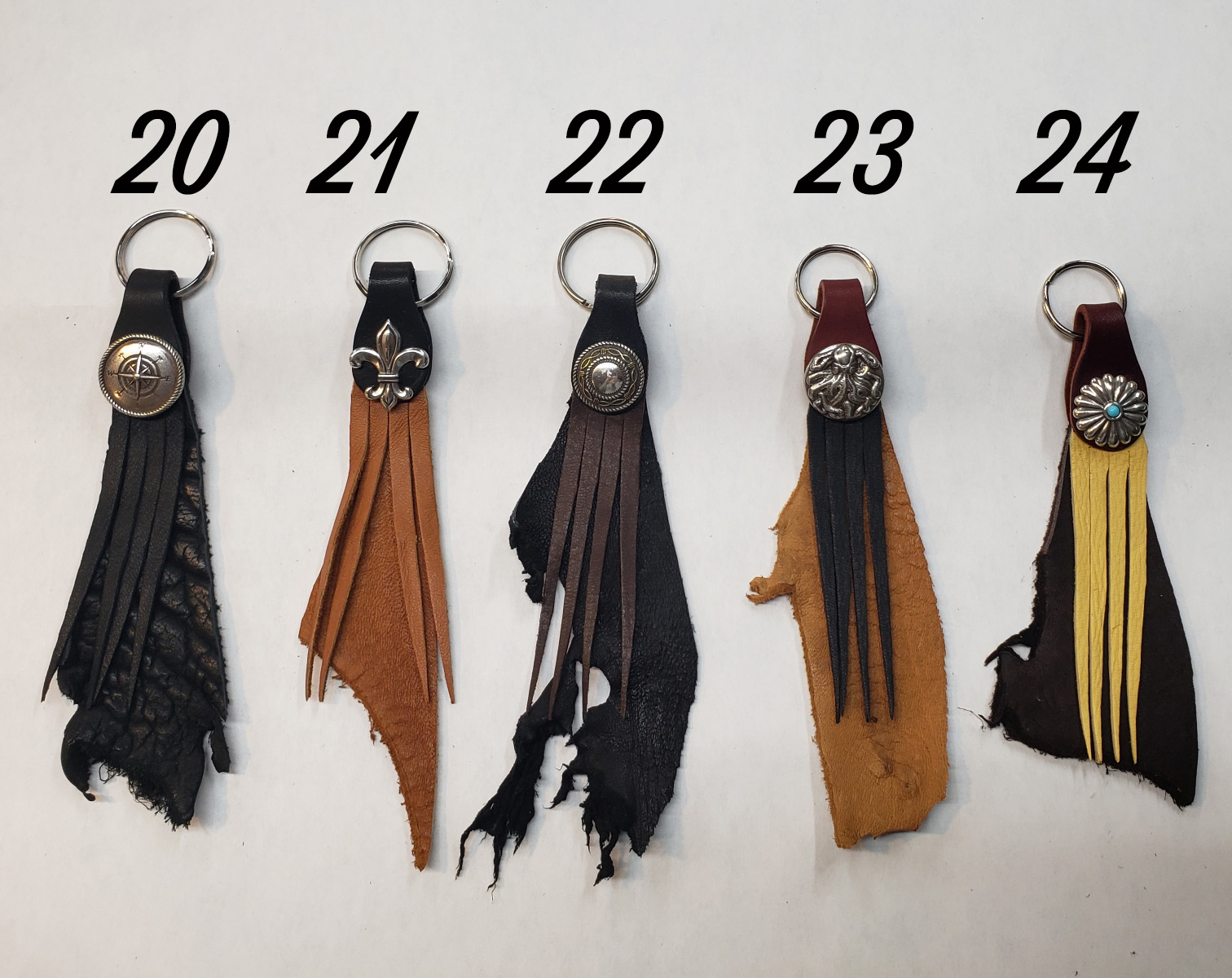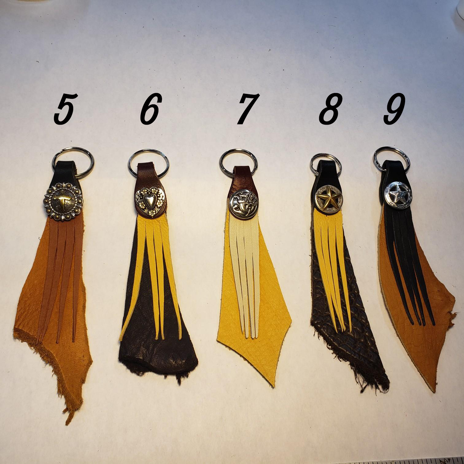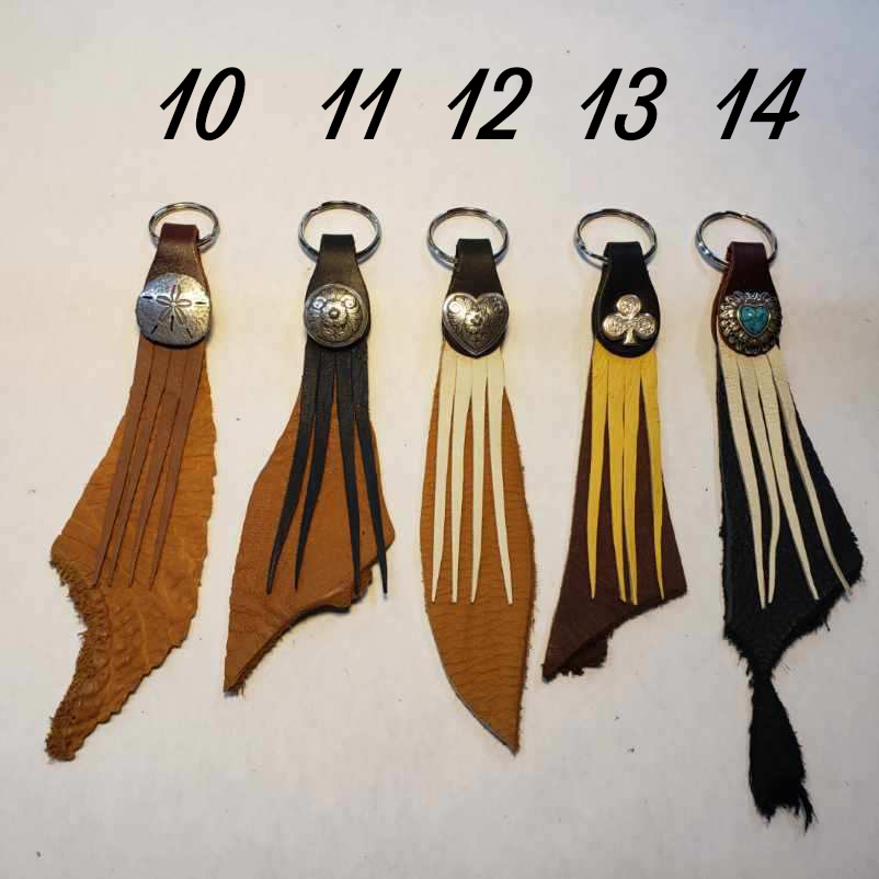 These Key fobs are One of a Kind. Made using Latigo ring mount, Elk or Buffalo back piece