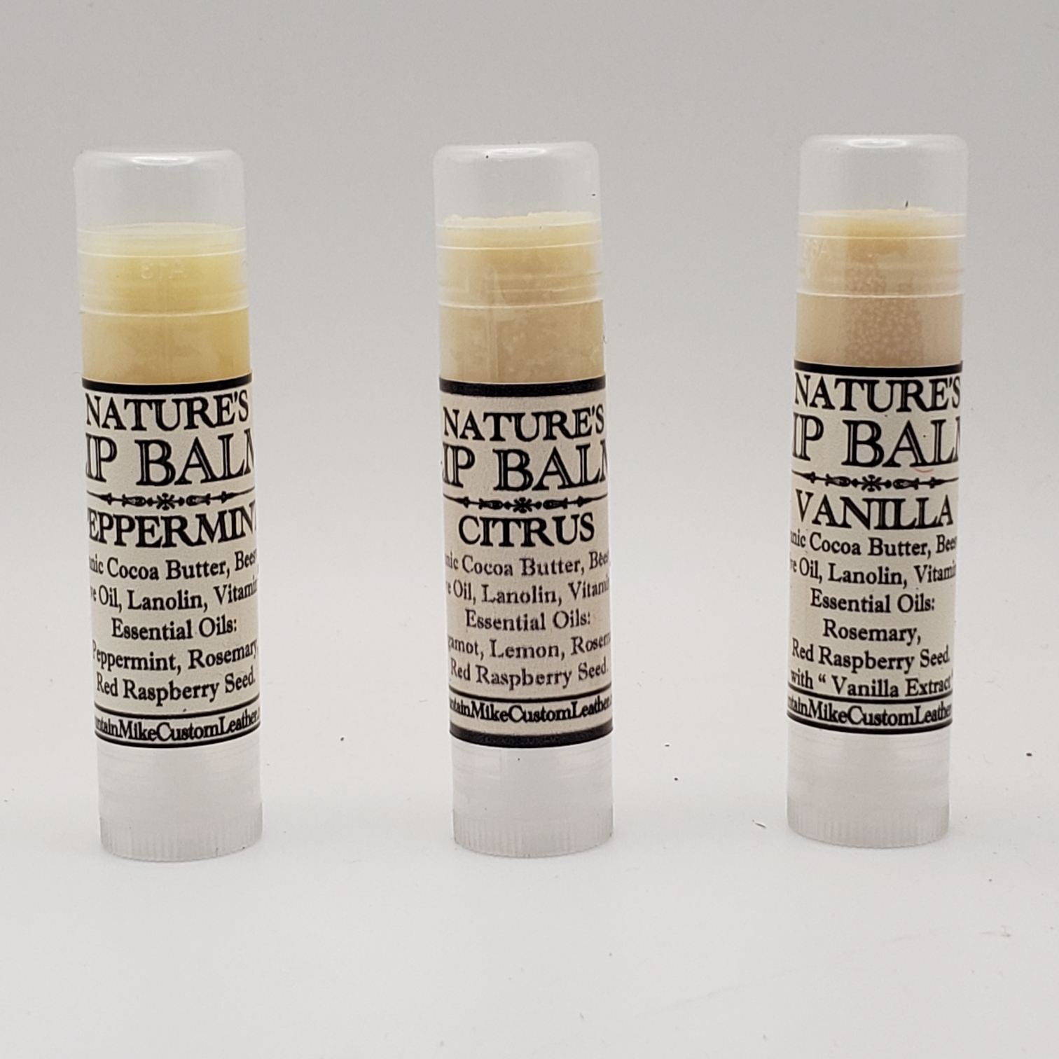 I offer in 3 delicious blends. I make this from scratch using my own unique recipe: Beeswax, Cocoa Butter, Olive Oil, Lanolin, Vitamin E, Essential oils of Red Raspberry Seed a sunscreen, Peppermint, and Rosemary. Very Healing and Rejuvenating. Won’t dry your lips like Petroleum based products can. Over 90 degrees Fahrenheit keep in a cool place. 2.5 ml.